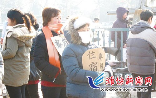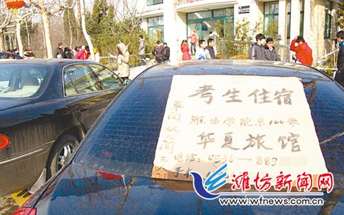 2月1日9时许,在潍坊富华国际展览中心报名点门前的广场上,一些举着各种住宿广告牌的中年人引起了记者的注意。他们不时与来往的考生搭话,询问是否需要房间住宿。这些人推荐的多数是家庭改装的简易宾馆,价格相对廉价,有一定的学生市场。