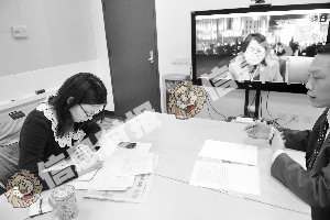 信息时报记者在澳大利亚驻广州领事馆通过视频系统采访澳大利亚驻上海总领事馆教育负责人。