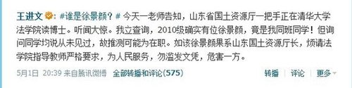前天,清华大学博士生王进文微博爆料称,山东省国土资源厅厅长徐景颜与自己同为法学院在读博士生,但从未见过此人上课,此事立即引发热议。有网友质疑校方滥发文凭和官员挂名读博。山东省国土资源厅回应,厅长徐景颜确为清华在职博士生,但对从未上课说法予以否认。
