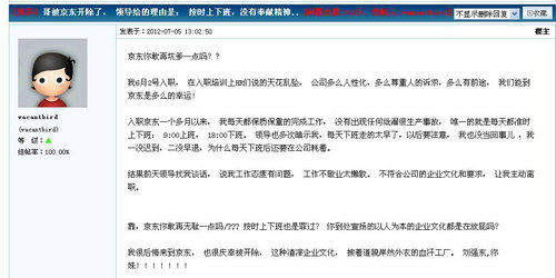 一篇帖子在网上流传,一名网友指出,因为每天正常上下班,被京东商城开除。此帖一出,引起网友的热烈讨论。