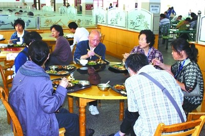 校友们在学校食堂重温“大锅饭”。