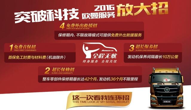 2016年,欧曼对服务进行全面升级,通过实行ISG发动机首保免工时费与材料费(机油除外),保修期内不限故障模式提供免费外出以及整车零部件最长42个月保修与10万公里超长保养等服务大招有效开启重卡行业服务超长免费时代,助力用户省维修及首保费13000多元/年/车,从而以省心、省事又省钱的服务政策让用户得到实实在在的收益。