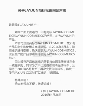 但为遵守产品包装标识需要与公司注册商标完全一致的原则,同时为了不让消费者混淆品牌标识,公司将于2016年5月开始,再次变更印刷标识,将统一使用JAYJUN COSMETIC标识。