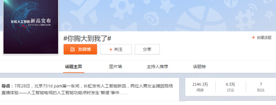 当然,在线上面对这么多人进行内容发布,直播是不够的,还得有爆点。为了让发布会更有故事可讲,长虹精心设计了一场“主播撕逼事件”,通过男女主播为体验长虹人工智能产品—长虹CHiQ人工智能电视时发生争执,从而体现长虹CHiQ电视:三秒即播、语音控制、兴趣推荐等人工智能特点,由事件引出的话题#你胸大到我了#在新浪微博就突破2100万关注,并荣登热门榜单第五位。