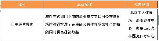 自主经营模式政府主管部门下属的事业单位专口对公共体育场馆进行管理,在保证公共体育场馆社会效益 的同时提髙经济效益北京工人体育场、济南奥体中心、秦皇岛市奥林匹克体育中心