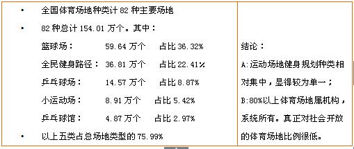 这两个表想表达的其实就是“总量不足,分配不均”:功能单一、利用率低、经济效益差、经营管理方式落后及维修资金缺口大等问题,特别是大型公共体育场馆巨大的运营管理费用造成了政府沉重的财政负担,占据体育财政总支出的 30%。从政府的角度考虑也许是需要大量地盖体育场盖地标,而从商业资本及社会效益的角度来说,怎么充分利用场馆资源使其在公益或者半公益的状态下可以健康运营下去才是最重要的。而从投资的角度来说,挣钱是必须的,那哪些类型场馆或者什么样的运营方式才可能挣钱呢?