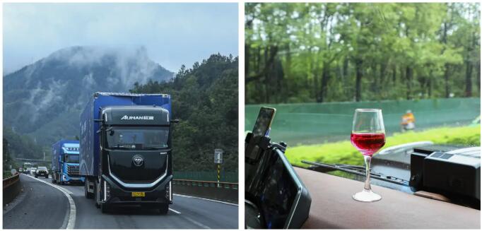 面对陡坡急弯,欧曼银河9混动的“油电协同”逻辑再度彰显实力。其搭载的福康620马力混动发动机与300马力电机组合,再加上最新一代12挡混动专用变速箱,经HCU“智慧大脑”实时调控,下坡时自动启动势能回收模式,将车辆的动能转化为电能存储,同时提供辅助制动,形成双重防护,解决西南山区长下坡“制动衰减”的痛点。上坡时电机瞬时补能,让发动机始终维持在高效转速区间,油耗较传统燃油车降低20%+的山区实测数据在此路段得到充分印证。而且驶入成都郊区后,工作人员在银河9混动驾驶室内放置一杯红酒测试稳定性:即便经过井盖、轻微起伏路面,红酒始终未洒,这印证了其底盘调校优势:优化的悬挂与车身稳定逻辑能有效过滤颠簸,满载状态下也能保障行驶稳定、驾驶舒适与货物安全。