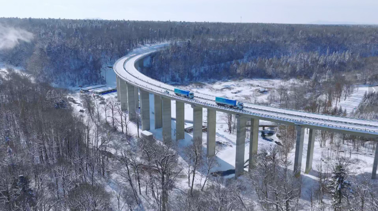 更关键的是,欧曼银河纯电重卡的底盘经过百万公里寒区标定,由专属团队调校的悬架系统,针对冰雪路面调整了悬挂硬度与减震阻尼,降低了车辆重心,大幅提升车身稳定性。在长白山及通化段的连续弯道测试中,欧曼银河纯电重卡动力输出稳定,加速、并线动作干脆利落,车身姿态稳定无明显侧倾,即使行驶在“雪路”上,也能凭借精准的操控反馈平稳应对,未出现任何失稳迹象,进一步提升车辆安全防护,解决寒区纯电重卡“不敢开、开不稳”的核心痛点。