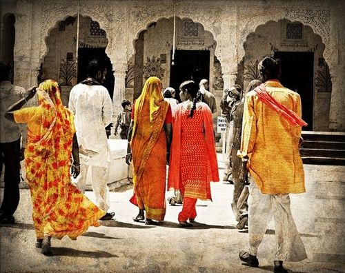 印度的大部分颜色,都体现在印度女人身着的纱丽上。据传,纱丽有五千多年的历史,在印度古代雕刻和壁画中就常见身披纱丽的妇女形象。在民间,相传纱丽的由来,有一段唯美的故事。一位十分有才华的织布能手,一天晚上,他做了一个奇异的梦,梦见一位梨花带雨的女子。她黯然神伤的眼泪,闪耀着丝质般的荧光;瞬间变幻的表情,仿佛轮回的鲜艳色彩;秀美飘逸的长发,缠绕身上如同霓裳;轻盈娇俏的身形,浑然绢绸一般的柔顺。醒来的织匠,犹如醍醐灌顶,豁然开朗。于是,他仔细研究女性的体态,加上自己的奇思妙想,终于织出了一件娇艳动人的衣裳,并将其命名为“纱丽”。