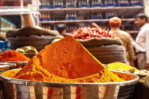 不仅纱丽色彩丰富,就连印度的食材也同样色彩斑斓。对于印度菜,香料才是主角。茴香、荳蔻、蕃红花、芥子油、丁香、咖哩粉、胡椒、洋葱、清油,不但五颜六色,调配出的香气更是浓郁、层次复杂。其中,蕃红花是世所公认最昂贵的香料,取其三株雌蕊干燥而成,给予食物美妙的香气和高贵的黄色金泽,是大厨们的最爱。胡椒更是出现在马可波罗和玄奘的笔下,它的重要性,不言而喻。果实青色未成熟,採下泡盐水,即为青胡椒;如果採下直接日晒后,便是黑胡椒;等果实转红成熟时,去除黑壳,干燥后就是白胡椒。而咖喱之本姜黄,取姜类的根茎,干燥后磨成深黄色的粉末,其味浓略苦、辛香轻淡,是咖喱之本,让其呈现金黄色。