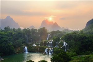 德天大瀑布横跨中国、越南两个国家,是亚洲第一、世界第二大的跨国瀑布。它起源于广西靖西县归春河,终年有水,流入越南又流回广西,经过大新县德天村处遇断崖跌落而成瀑布。与普通瀑布不同,由于地形特殊,德天瀑布呈现出“三级跳”的落势。枯水期的时候,瀑布分割成十几道大小不一的水流,中间间隔山石绿树,显得秀丽无比。丰水期的时候,十几道小水流连成一片,浩浩荡荡,如匹匹白色骏马奔腾跳跃,非常壮观!