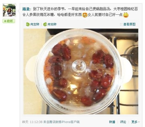 显然,不少网友已经开始了秋季大补的匆匆步伐,然而大多数人还是认为:补品多多益善。博主“雨柔”就说:“到了秋天进补的季节,一早起来给自己煲锅甜品汤,大枣桂圆枸杞百合人参果玫瑰花冰糖,哈哈都是好东西”