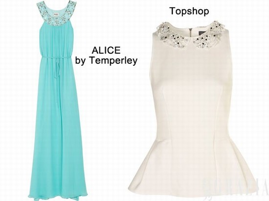 如果要参加鸡尾酒会、婚礼或者是其它各种花哨的交际场合,这种领口的小火花就更有用武之地了,比如说把串珠和部落风格的印花拼接在一起,或者是像安妮海瑟薇(Anee Hathaway)那样,简单的线条加上宝石花朵的灿烂,要气质有气质,要美貌有美貌,时髦得一塌糊涂!