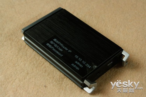 机身正面中间位置丝印有飞狗的logo,而背面的右小角则贴有一块四方的透明胶纸,胶纸上丝印有路由器IP、用户名、密码等信息。为何不知直接丝印在机身上,而是丝印在透明胶纸上呢?这是因为用户知道这些信息后,可以很方便的撕掉这层胶纸,不会影响到产品美观。