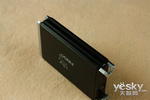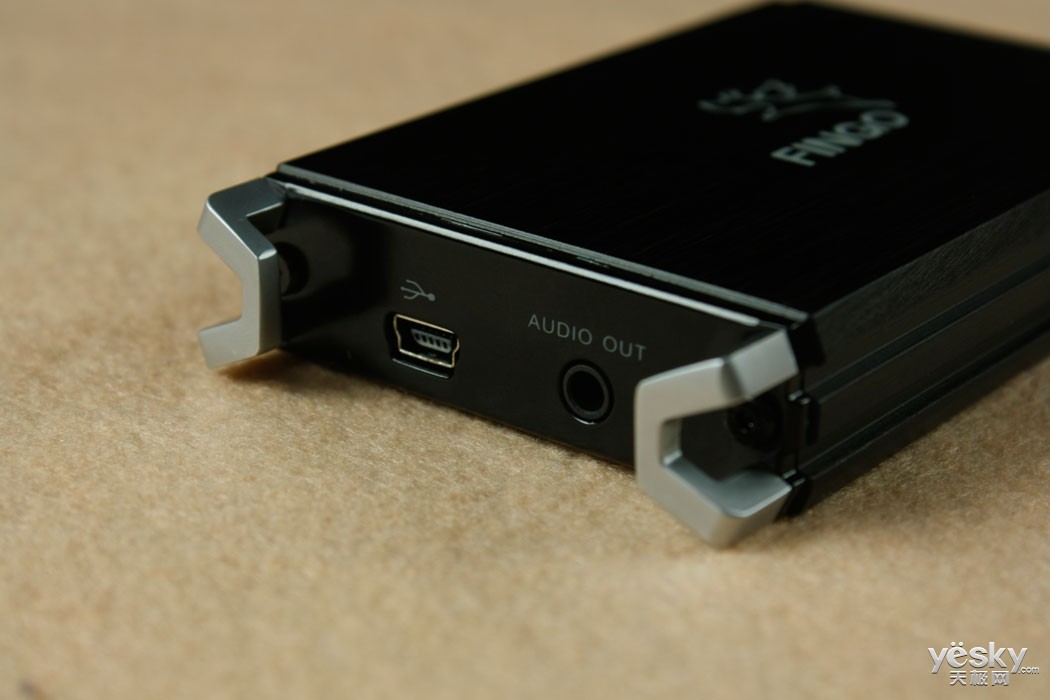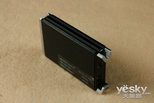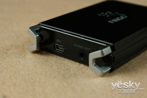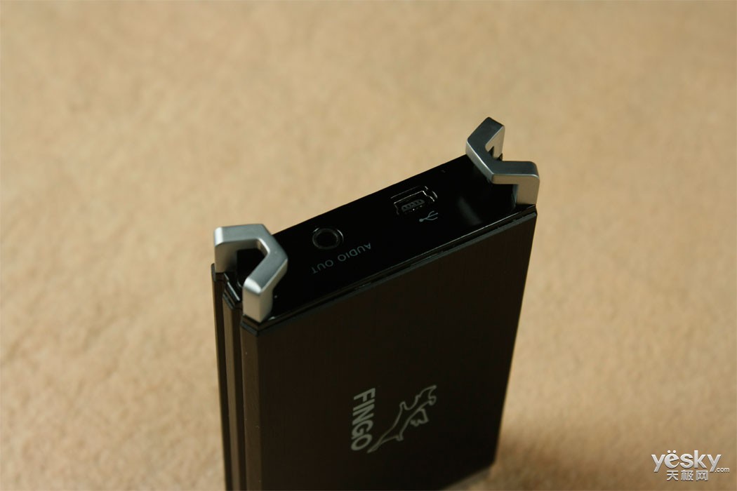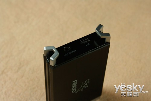 机身顶端有两个接口,左边的是电源适配器的USB插入接口,另一个是标准3.5mm音频线输出插孔,音箱的3.5mm音频线就是连接到这个插孔。机身顶端两边有装配有两个突出的部分,可以用来将机身挂住。露出的部分也是金属材质,采用了中空梯形的形状。