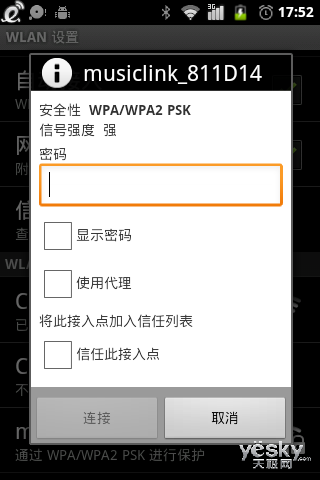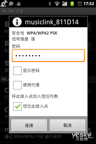 2、用播放设备搜寻WIFI热点SSID(MUSIC LINK),联接本机(初始密码12345678)。