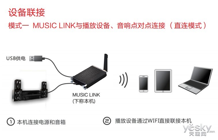 模式一:MUSIC LINK与播放设备、音响点对点连接 (直连模式)