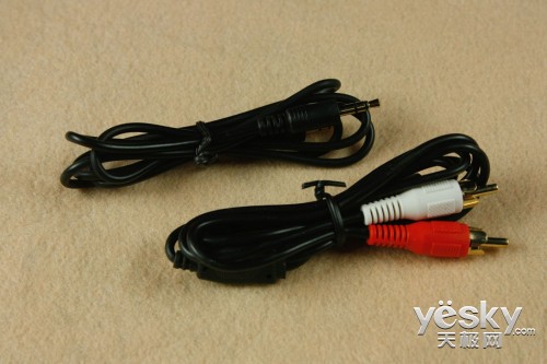 附件方面有两条数据线,一条是两端都是3.5mm插头的;另一条是一头是3.5mm插头,另一头是2个莲花插头的。两种不同的数据线,方便连接不同接口的设备。