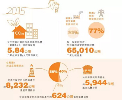 报告中,安踏公布了2015年公司的温室气体排放数据。数据显示,安踏2015年经核算的温室气体总排放量为65010公吨二氧化碳当量(CO2e,用作比较不同温室气体排放的量度单位,可以计算出不同温室气体排放对全球暖化的影响),相当于每收益一百万元人民币排放5.84公吨二氧化碳当量。其中,使用天然气产生的温室气体约8232公吨,占总体排放量的56%,高于使用煤炭排放的5944公吨温室气体。