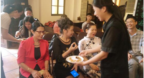 在嘉宾们的热切品尝下,陈李济陈皮豆沙月饼很快分发完毕,到了第三个步骤:再饮陈李济柑普茶,吃完陈李济陈皮豆沙月饼之后第二次喝陈李济柑普茶,可以很好的消除甜腻,虽然嘉宾们都表示这款月饼并不甜腻,配上陈李济柑普茶的享受真是无与伦比。