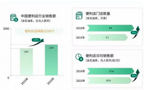 《2017中国便利店发展报告》指出,2016年便利店行业增速达13%,市场规模超过1300亿元,开店数量及同店销售双双增长——目前国内便利店品牌已超过260个,2016年便利店数量同比增长9%,销售额同比增长13%。