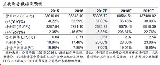 报告中,海通证券对融创公司2017-19年的营业收入及净利润等主要财务数据进行了预测称,2018年,融创的净利润将实现翻倍增长。