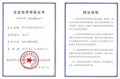 长路电气在方方面面对自身的严苛要求,为公司赢得了交通部、国家电网、电信运营商等广大客户的认可和信任。而也正是由于在经营状况、履约能力、企业信用、社会信誉等方面的杰出表现,8月2日,长路电气获得企业信用最高评级——AAA级。