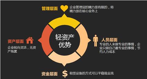 所谓企业轻资产,是指企业紧紧抓住自己的核心业务,而在非核心业务上减少投入或者外包给第三方,最大化的降低成本,减少资金占用和资产负重,以较低的资本投入获得较高资本收益的一种运营模式,其核心理念就是用最少的资金去撬动最大的资源,赚取最多的利润。因此可以发现,轻资产两个核心特点就是增强资金的灵活性,降低资产的配重。