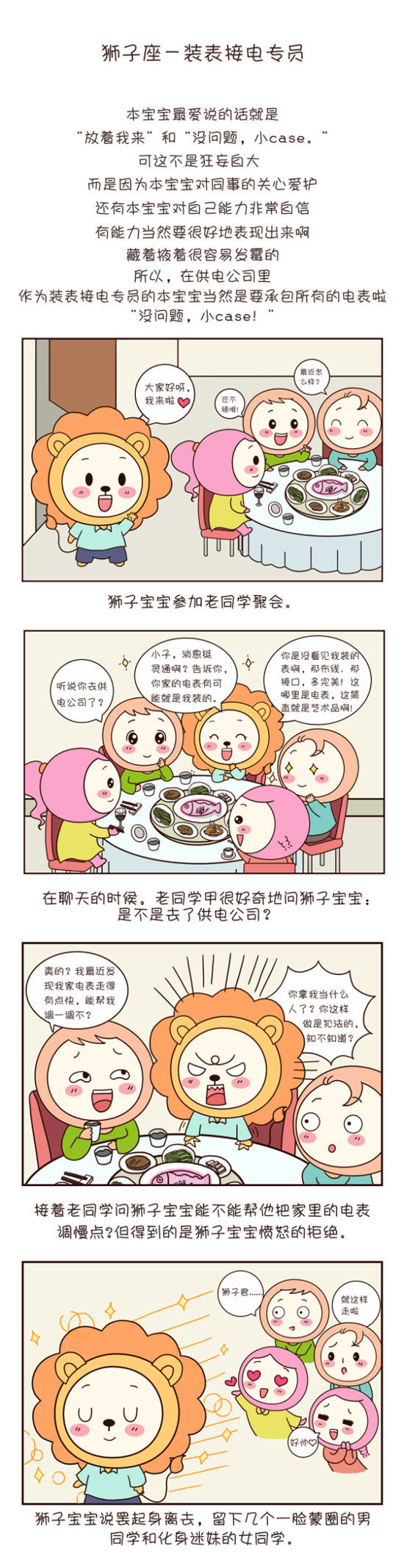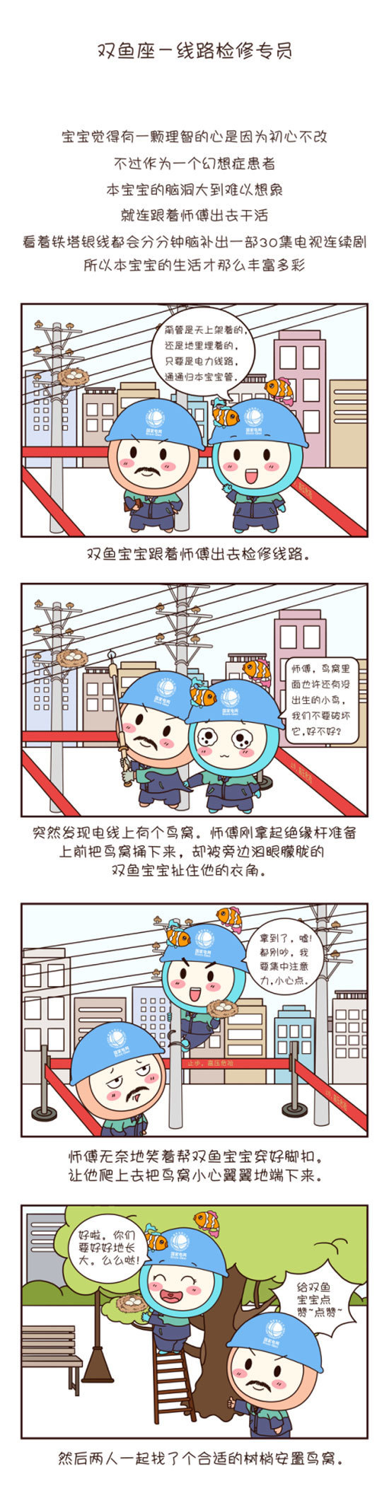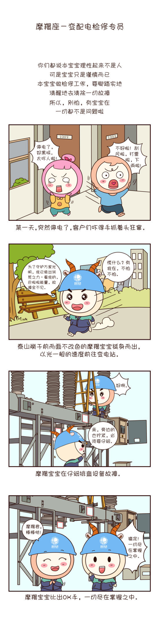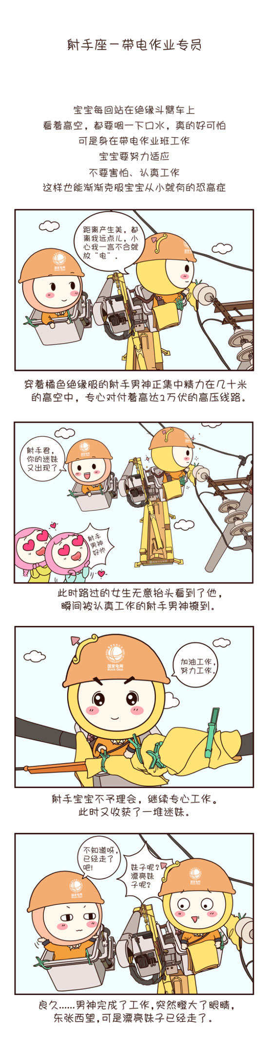 【正义感】白羊宝宝无时无刻不散发着一身正气,再加上一身笔挺的工作服,别提多神气。再高明的窃电手段,也休想逃过他的X光眼睛。