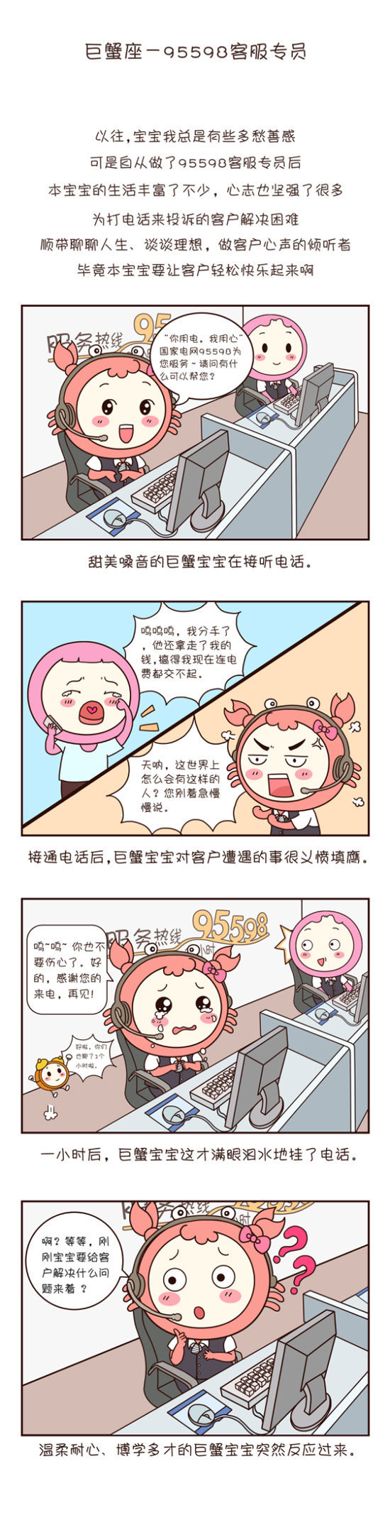 【同情心】95598客服专员里来了巨蟹宝宝,温柔耐心又甜美的声音让客户都忘了自己打电话来是要投诉的,甚至,他还能和你聊聊人生,谈谈理想呢!