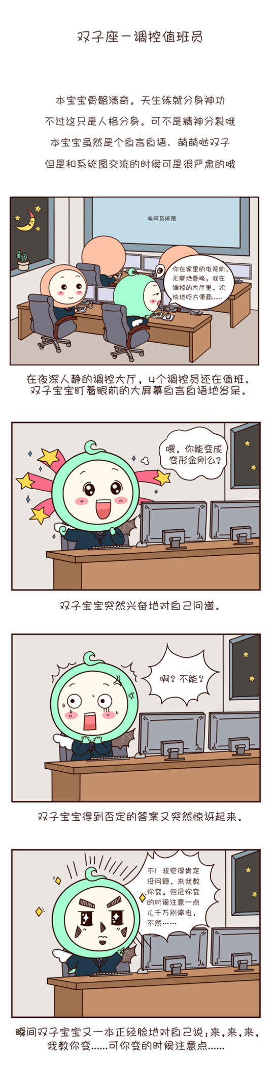 【双面性】人格分裂的双子宝宝做了调控值班员,调控大厅一下子多了两个人!从此调控大厅热闹起来了,因为他不仅能和自己聊天,还能和系统图对话……