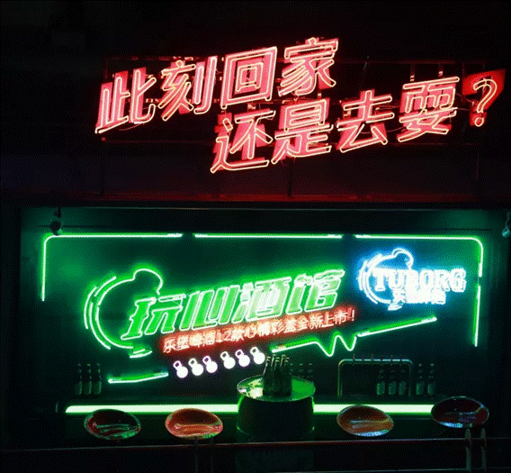 细心的市民也注意到,“玩心酒馆”除了外形高端大气,也在向行迹匆匆的路人灵魂发问:“此刻回家,还是去耍?” 寥寥几字,看似简单的选择题,却掀起了一场不小的讨论。记者随机采访了几位路人,一位刚加完班的上班族略显无奈:“每天睁开眼睛就是上班,下班的时候天就黑了,一般都没时间和精力去耍,只好选择回家。”而一位打扮潮酷的大学生则很兴奋地表示“有时间就要约上朋友去耍,一起开黑喝酒!”