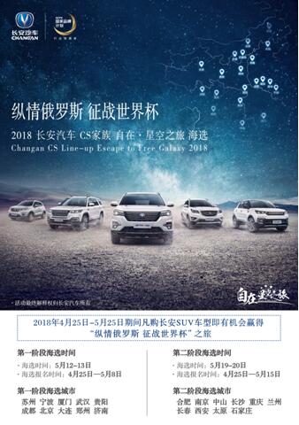另外,长安汽车即将在6月份开启第四季星空之旅活动,即日起至5月25日,购长安CS车型均有机会搭乘星空之旅,直通俄罗斯,同新CS75一起探索星空,畅享世界杯。