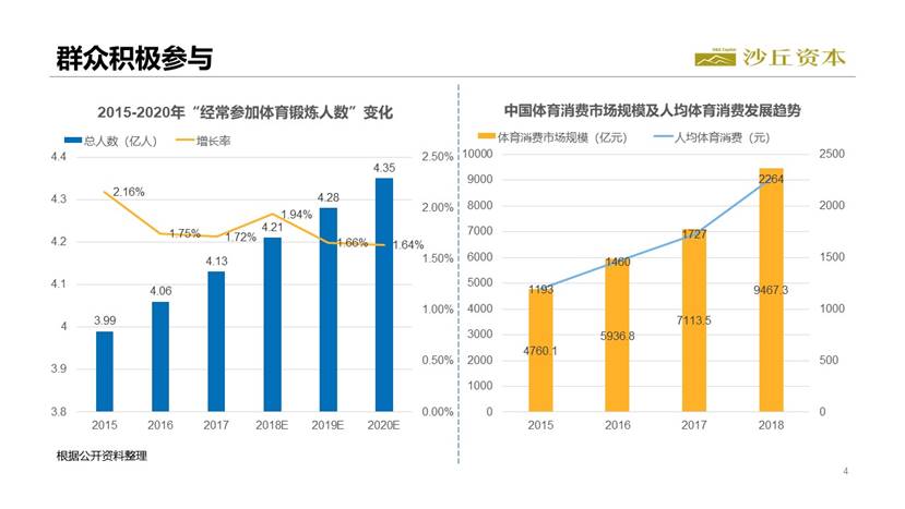 在政策的推动下,中国体育市场人均消费水平从2015年的1193元提升至2018年的2264元,经常参加体育锻炼的群众数量也在持续增长但变化幅度并不是很大。从我们的角度分析,这一现象产生的主要原因是参与运动的人首先会去添置装备用品,较大拉动了体育消费的增长。体育运动参与人群的规模与社会环境、受教育程度等因素相关,难以在短期内就达到数倍的增长。总体而言,近几年的数据确实呈现了一个较好的成长态势。