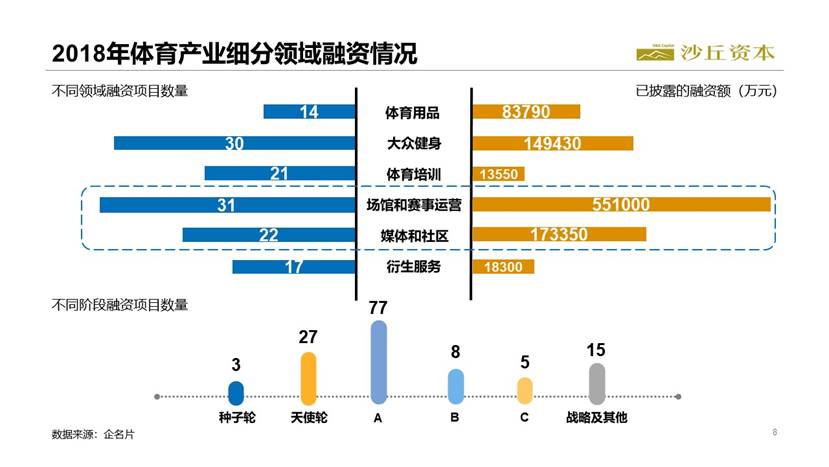按照体育用品、大众健身、体育培训、场馆和赛事运营、媒体和社区、衍生服务六大版块划分体育产业,可以发现2018年资本主要集中于场馆和赛事运营,融资金额和获投项目数量都位居首位,社区也是热度较高的投资领域,大众健身领域紧随其后。该数据与沙丘资本管理团队的直观感受近似,我们可以发现近两三年来场馆建设、赛事运营、新兴品牌崛都具有一定趋势性。而大众健身作为参与人群最广泛的活动,更易产生经济效应和社会影响力,无疑成为一个非常值得投资的领域。