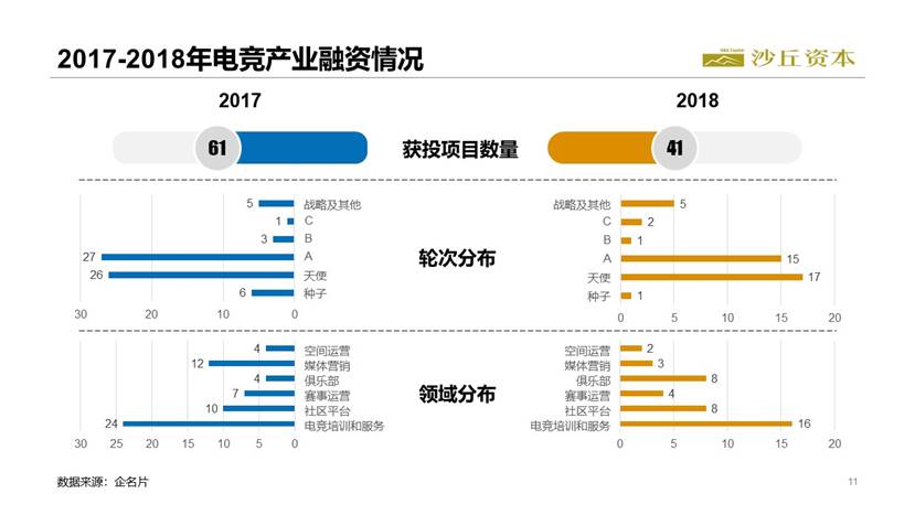 电竞领域我们也进行了数据统计,可以看出2018年与2017年相比融资情况有明显的下降。除了虎牙等直播平台类项目有明确的发展思路之外,俱乐部、媒体、赛事运营等似乎都缺乏明确的发展思路或者未形成投资效益,因此该领域的融资项目仍以天使和A轮为主。
