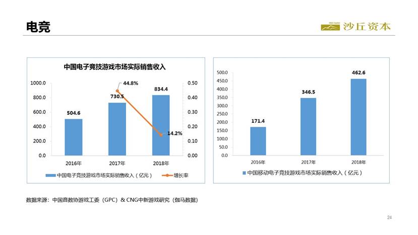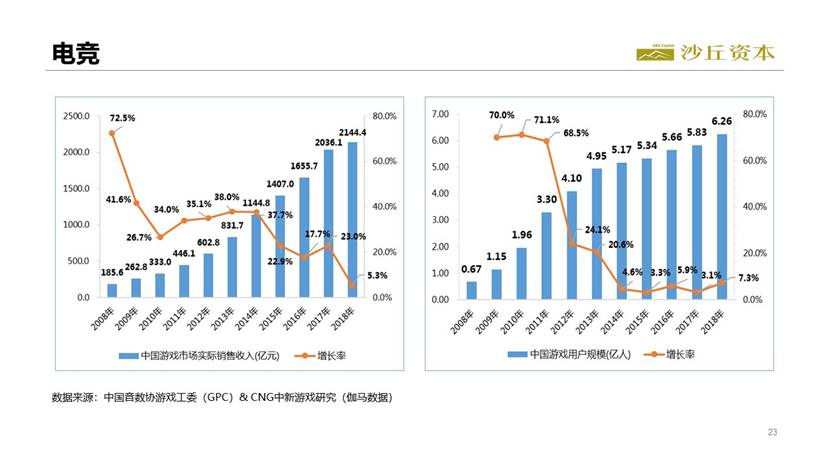 第二个增长点是电竞体育。从游戏用户的增长来看,中国已经成长为一个巨大且成熟的市场。尽管近几年游戏用户数量似乎并没有显著增长,但是存量市场的消费规模却节节攀升,6亿玩家、2144亿元销售收入成为客观事实。其中电竞市场份额达到834亿元,伴随着移动设备计算能力的增长以及4G网络的普及,移动电竞在过去3年实现两倍多的成长。从影响力来看,电竞赛事的观看人数、微博转发数等已经不逊于世界杯总决赛。