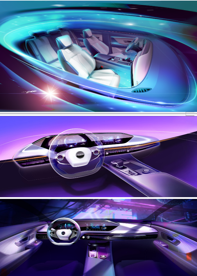 内饰渲染让视觉浸入梦幻宇宙,营造出动感环抱氛围,蓝白内饰相映成趣,营造一种“瀚海辰星”的品质之美。