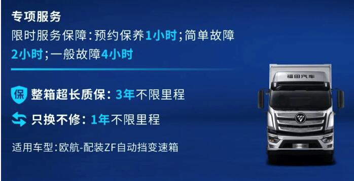 为了让用户更快的感受到自动挡产品的魅力,欧航欧马可更推出自动挡产品专属的客户权益。其中,配装采埃孚中型变速箱的欧航自动挡超级中卡,不仅享受变速箱3年不限里程质保,1年不限里程只换不修的超级权益,更尊享预约保养1小时;简单故障2小时;一般故障4小时解决的限时服务保障;欧马可自动挡产品前5000名用户不仅享受变速箱终身质保,2年/10万公里只换不修的超级权益,启动首批体验官招募,前50名用户尊享手动挡同价,前5000名用户加3000元升级自动挡。丰厚的客户权益方案,在极大降低客户车辆购置及使用成本的同时,也让更多的用户享受更舒适、安全、可靠、高效的产品和服务。