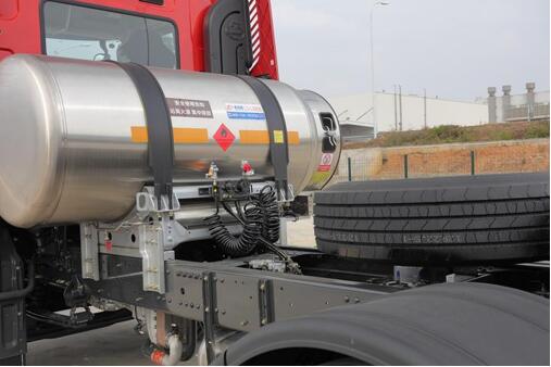 我们实拍的这台车就装配了1000L的储气罐,续航能力最大达2000公里以上,强悍的续航能力可以轻松满足长途干线物流运输工况的使用需求。