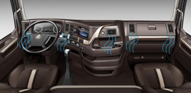 对于驾驶员而言,每天接触最多的地方莫过于座椅与方向盘,在这一方面的配置上,乘龙H7 LNG牵引车采用了多功能气囊座椅+多功能方向盘的方案。座椅表面采用高端皮革打造,带有软硬、高度调节,腰部支撑与通风加热功能也均有配备,长途驾车降低驾驶员疲劳程度。