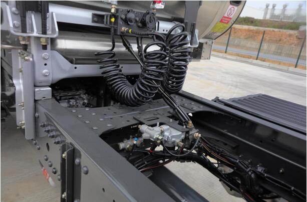 变速箱匹配12速变速箱,内部全同步器+全斜齿设计,挂挡轻便,全铝制壳体有利于降低整车自重以及给变速箱内部油液散热。变速箱可选配伊顿AMT、液力缓速器等配置,最大制动扭矩4000N.m,长下坡使用缓速器后可减少制动使用频率,降低制动系统磨损也发热,更安全的下坡。