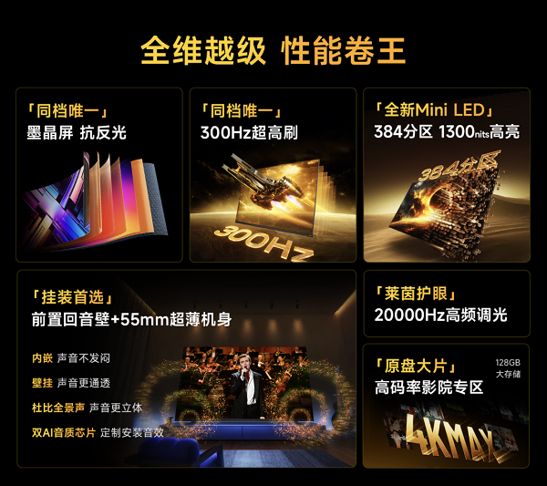●画质卷王实力解析: 搭载与万元级高端电视同款的墨晶屏抗反光技术,通过精密光学设计解决日常观影痛点:高精细双 AG 抗光层让抗反光效果显著提升,白天阳光西晒环境下无需拉窗帘也能看清画面;LR 低反层带来 5500:1 实看对比度,通透感远超普通标称 7000:1 的机型;近 180° 广视角让全家围坐观影时,任意位置都能获得一致的清晰画面。同时,320 阶独立控光分区精准控制每一处明暗,呈现深邃夜空与璀璨灯火的干净画面;XDR 1300nits 稳定峰值亮度真实还原 HDR 内容的光影细节,亮部不过曝、暗部有层次。搭配 96% DCI-P3 影院级广色域、10.7 亿色显示和△E≈1 专业级色准,色彩表现鲜活惊艳。灵狮 AI 画质引擎还能将低清片源实时优化至接近 4K 观感,让经典内容焕发新生。